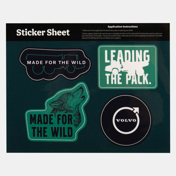 Sticker sheet includes 4 stickers. Made for the wild, Leading the Pack, Made for the Wild with wolf and Volvo iron Mark.