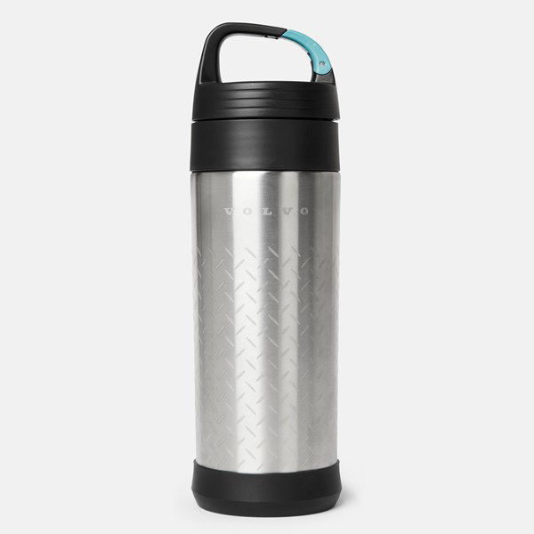 Smart travel mug with carabiner clip on lid. The 12oz. coffee vessel comes with a double-walled steel construction and a screw-on lid, helping to retain heat or cold for longer. Designed for mobile use, it features a carabiner handle that you can use to hook it onto a belt loop or hook, once finished with your coffee. Etched dirk sheet metal graphics featured with the Volvo logo front.
