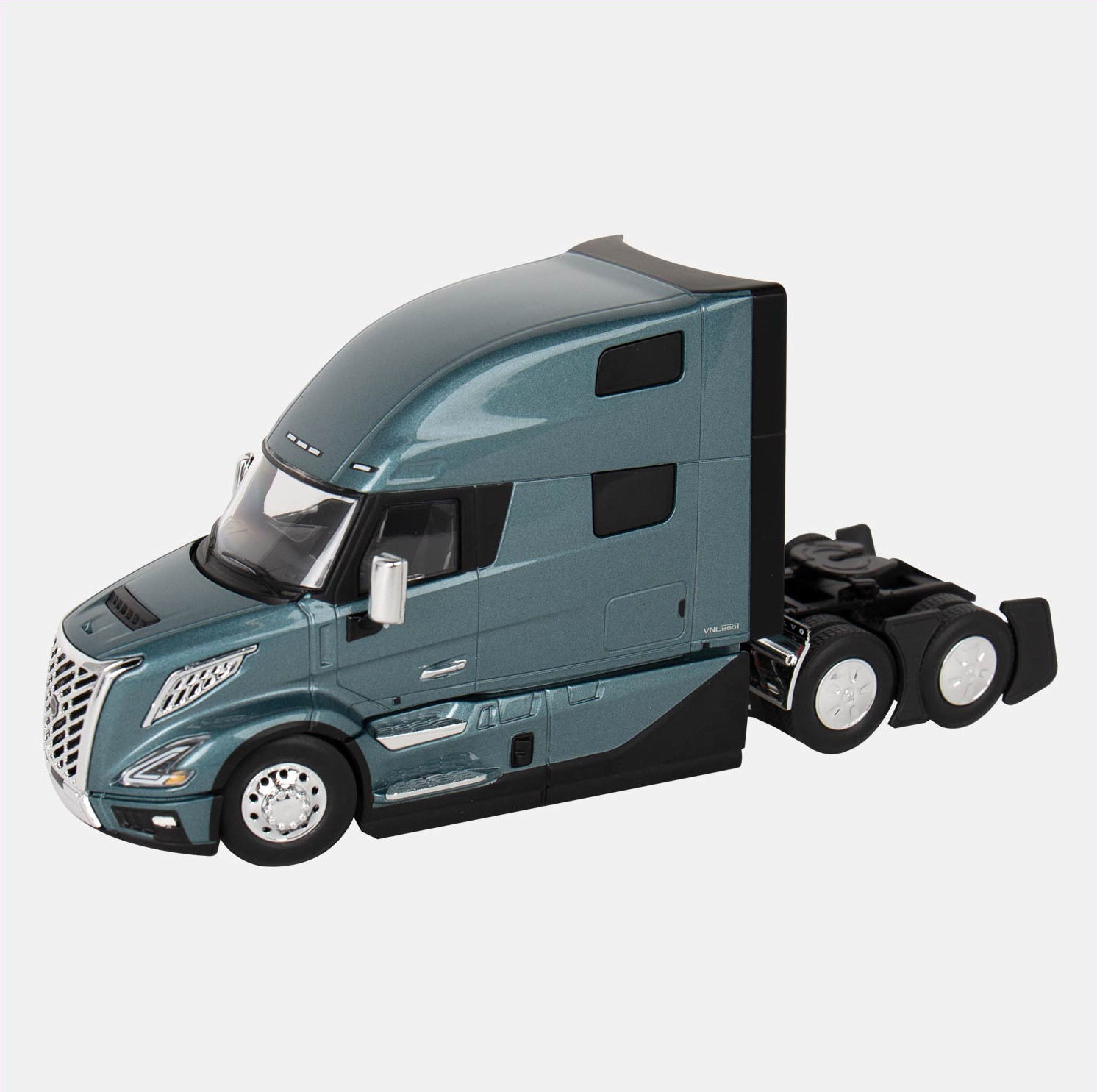 This authentic Volvo VNL 860 High-Roof Sleeper Cab diecast metal replica model features accurately detailed cab interior, pivoting fifth-wheel for trailer attachment, and detailed undercarriage. This quality replica is decorated with a Coastal Mist paint scheme.