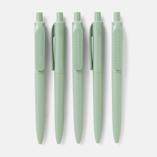 Pen in 5-pack with Volvo Penta logo and "Made to move you" print. All external casing components (casing, clip and push button) are made of polyhydroxyalkanoates (PHA), a biobased and biodegradable raw material. Microorganisms synthesize it in a natural way by the fermentation of sugars or lipids and also biodegrade it again in a natural environment. Only CO2, water and biomass are returned to the natural cycle.No toxic nor harmful substances are used or brought about in the production of PHA. The process is safe, non-toxic and does not release harmful substances.